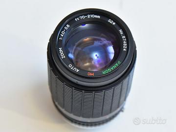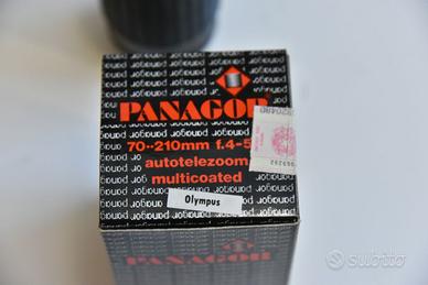 Ottica zoom Panagor con attacco Olymus OM 70-210mm apertura massima 4/5.6 attacco filtri diametro 52. Completo di imballo originale tappi e borsa.