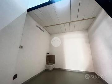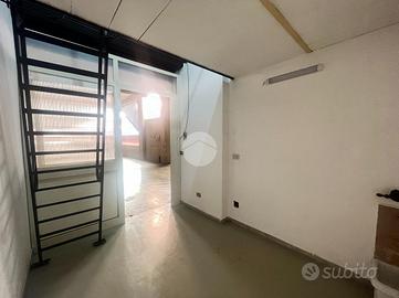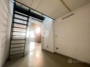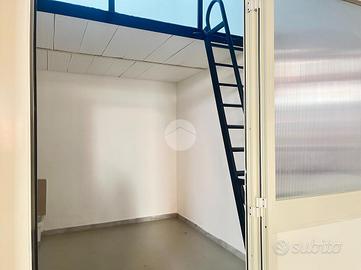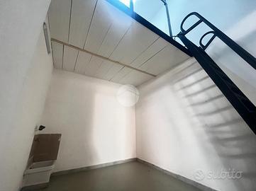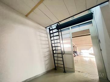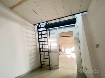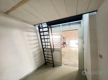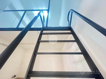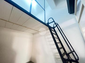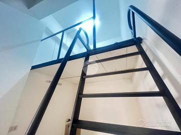 Il soffitto abbastanza alto ha permesso di realizzare un soppalco pratico e ben strutturato. La scala in metallo permette di accedere facilmente al piano superiore, ideale per riporre scatole o attrezzature.