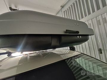 Box auto 430lt.colore grigio con chiusura a bloccaggio anteriore e laterale con chiave cinghie interne per bloccaggio bagagli.