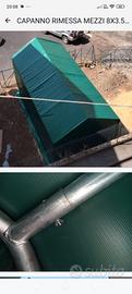Vendo box camper altezza MT4. Lunghezza 8MT. Larghezza 3.50 struttura completamente smontabile robusta c compreso telone molto pesante dotato anche di finestre in alto per areazione.con Doppia porta anteriore e posteriore chiuse ma con cerniere apribili e tensionatori laterali completa di tutto occorrente già smontata e messa su scatolone usata pochissimo! Come nuova come in foto.(( prezzo poco ma poco trattabile)) non spedisco solo ritiro di persona. Grazie no offerte ridicole! RIPETO : Struttura come nuova usata pochissimo.