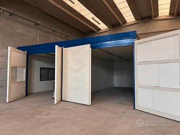 Cabine industriali prefabbricate modulari (2 moduli) - grandi dimensioni Vendesi cabina industriale prefabbricata composta da 2 moduli uniti, in buone condizioni, ideale per uso professionale. Dimensioni totali: o Altezza: 3 m o Lunghezza: 9,60 m o Larghezza totale: 7,80 m (2 moduli da 3,90 m ciascuno) Caratteristiche: o Struttura modulare con pannelli isolanti (spessore 10 cm) o Cabine completamente isolate o Possibilità di utilizzo anche separato (2 cabine) o Ampie porte frontali o Porta laterale con finestra o Finestre laterali o Illuminazione interna installata o Struttura robusta in metallo Ideale per: o Cabina di verniciatura o Officina / laboratorio o Magazzino o Spazio di lavoro isolato Condizioni: buone, pronta all'uso Smontaggio e trasporto a carico dell'acquirente. ? Visibile su appuntamento ? Prezzo: 9.000 € trattabili Contattami per maggiori informazioni