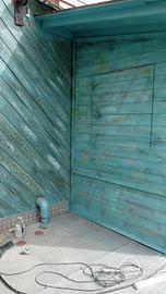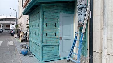 Vendesi casetta in legno ideale per creare chioschetto bar, per magazzino attrezzature, casetta giardino e altro. Dispone di 3 aperture a ribalta con disposizione a banco appoggio, porta di entrata. Lunga 244 cm, profonda 165, tetto a spiovente per la pioggia 378 cm x 210 cm.