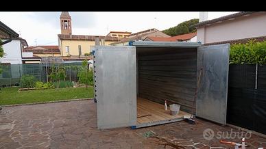 vendo container 2x2x4 metri utilizzato esclusivamente per stoccaggio motoveicoli. Il container pesa complessivamente 560Kg ed ha una capacità di carico di 1500Kg. Il container può essere smontato in 6 facce comodamente trasportabili semplicemente svitando 12 bulloni. Vendo con trasporto a carico dell' acquirente. Prezzo trattabile.