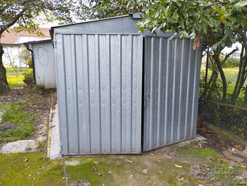 Garage smontabile da esterno in lamiera zincata, lunghezza 600 cm, larghezza 250 cm, altezza ai lati 200 cm con picco centrale 240 cm, mod. standard, usato per circa 12 anni, ma ancora in condizioni molto buone poiché é stato sempre utilizzato con rivestimento interno in legno.