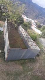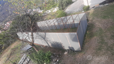 Vendesi box in lamiera di grandi dimensioni ma modulabile...largo 18 mt. Lungo 6 mt. Alto 3.50 che scende a 3 mt. Praticamente sono 7 garage di 6 mt. per 2.5 mt altezza entrata 3 mt. affiancati. Il tetto è già stato smontato ma ho tutti i pezzi.