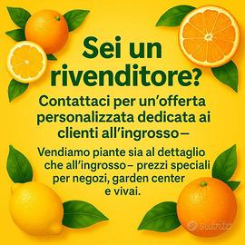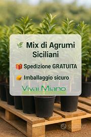 🌿 Agrumi Siciliani – Componi il tuo Mix Personalizzato Con questa proposta puoi creare una combinazione di 100 piante scegliendo liberamente le varietà che preferisci. La spedizione è sempre gratuita e ogni pianta proviene direttamente dal nostro vivaio. 🌱 Cosa riceverai Piante di agrumi innestate e coltivate professionalmente Età indicativa: 18–24 mesi Altezza media: 100–140 cm (comprensiva del vaso) Vaso da vivaio di qualità Piante vigorose, sane e pronte allo sviluppo e alla produzione 🍋 Varietà selezionabili Hai la possibilità di scegliere tra un’ampia gamma di agrumi: Arance, Mandarini, Clementine, Limoni, Lime, Cedri, Bergamotti, Pompelmi, Finger Lime e altre tipologie particolari disponibili nel periodo. 📌 Modalità di scelta delle varietà Dopo aver effettuato l’ordine (o anche prima, se preferisci): Puoi comunicarci direttamente la lista delle varietà che desideri oppure Ti ricontatteremo noi per definire la selezione insieme. In mancanza di preferenze specifiche, creeremo noi un assortimento bilanciato con le piante migliori disponibili. 🌳 Perché scegliere il nostro vivaio Produzione interamente siciliana Piante curate e innestate da personale specializzato Imballaggi rinforzati per una spedizione sicura Supporto post-vendita dedicato ⚠️ Informazioni utili Le foto rappresentano realmente il tipo di prodotto spedito La presenza di fiori o frutti dipende dalla stagione L’altezza può variare in base alla fase vegetativa e agli interventi di potatura 🛒 Sei un professionista del settore? Offriamo condizioni dedicate a rivenditori, garden center e vivai, con listini riservati per acquisti all’ingrosso. Contattaci per un preventivo personalizzato. 🌿 Piante certificate al 100%, accompagnate da passaporto fitosanitario conforme alle normative europee.