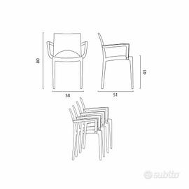 POSSIBILITA DI RITIRO A RICCIONE. Prodotti NUOVI e IMBALLATI IN CONFEZIONE ORIGINALE. 100% MADE IN ITALY DESCRIZIONE TAVOLI: • Marca: Grand Soleil • Riferimento: S6945RJ • Modello: Olè • Materiale: Polyrattan • Larghezza (cm): 80 • Altezza (cm): 72 • Lunghezza (cm): 80 • Peso: 6,2 Kg • Foro centrale per inserire l'ombrellone (35,7 mm) • Forma Tavolo: Quadrato • Perfettamente adatto sia ad ambienti outdoor che indoor • Piano quadrato privo di spigoli con bordi effetto intrecciato • Base a quattro gambe per una maggiore stabilità e comodità • Ean13: 7640179386913 DESCRIZIONE SEDIE: • Marca: Grand Soleil • Riferimento: S6614MK • Modello: Paris Arm • Pieghevole: No • Con braccioli: Sì • Materiale: Polipropilene • Larghezza (cm): 58 • Altezza (cm): 80 • Lunghezza (cm): 51 • Materiale struttura: Polipropilene • Scocca in polipropilene di alta qualità durevole e resistente all’uso quotidiano anche intensivo • Certificazione Contract (uso professionale) e conformità EN 15373:2007 • Metodo di produzione innovativo per massimizzare la robustezza • Struttura impilabile in più unità per ottimizzare lo spazio • Ideale per l’arredo di sale da pranzo, cucine, bar e ristoranti • Sedia adatta per l’uso sia interno che esterno • Ean13: 7640179385640