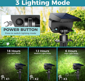 【3 modalità di illuminazione della luminosità】Kolpop faretti solari da giardino esterno, 3 modalità di luminosità considerate: si ha la possibilità di impostare dalla modalità alta (MAX 6Hrs) alla modalità media (MAX 12Hrs) o bassa (MAX 20Hrs) per estendere il tempo di lavoro.Quando la luminosità è abbastanza bassa da richiedere l'illuminazione, passerà automaticamente dalla modalità di accumulo di energia alla modalità di illuminazione che non richiede il rilevamento del movimento (auto on di notte/auto off all'alba)