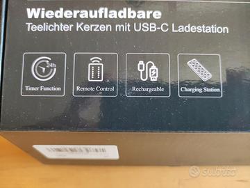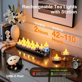 12 tea light a LED ricaricabili, con telecomando, luminosità regolabile, timer (2h, 4h, 6h, 8h).
