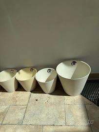 Materiale: plastica. Hanno un serbatoio a fondo vaso per la raccolta dell’acqua di scolo dopo innaffiamento. Sono 4 piccoli, 4 medi ed 1 grande