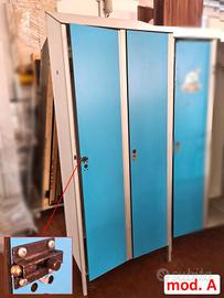 2 armadi per guardaroba spogliatoi usati, si tratta di 2 armadi spogliatoio azzurri con serratura, tetto inclinato, doppio vano interno vai e vieni e appendini per vestiti. alcune ante sono chiuse e non predisponiamo di chiave per aprirle mentre altre non rimangono chiuse. disponibilità: