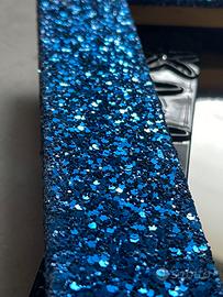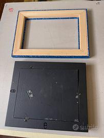 Due cornici nuove provenienti da negozio di Cornici che ha chiuso l'attività. Quella blu è completamente ricoperta di paillettes, brillantini. Quella nera è verniciata, laccata lucida, decorata in rilievo con fiori stilizzati e all'interno dei fiori sono incastonati delle pietre Swarovski o tipo Swarovski sono oggetti artigianali fatti in Italia che facevano parte di un campionario. La cornice nera ha dentro uno specchio è rivestita finta pelle sul retro, aveva la gamba per appoggiarla al tavolo, ma la gamba si è rotta e non è presente. la cornice blu è vuota, entrambe le strutture sono in legno, non plastica non resina non materiali scadenti, sono Cornici di qualità. Le misure interna utile della cornice blu è 20 x 30 la misura interna utile della cornice nera è 20 × 25.
