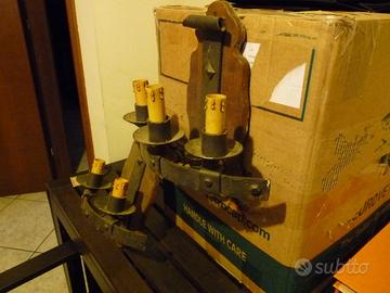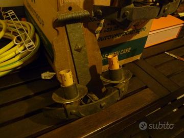 2 lampade da muro in ferro battuto a mano e legno originali, una a 2 fiamme e una a 3 fiamme, corrente a 220/230 Volt funzionanti, come da foto, spedizione eventuale a spese destinatario, possibile il ritiro in loco,,,