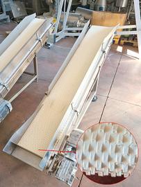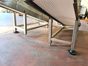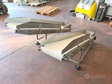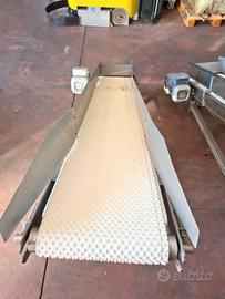 2 nastri per scarico prodotto usati, si tratta di due nastri trasportatori motorizzati con tappeto dentellato (vedi foto) in plastica alimentare, con telaio in acciaio inox per la movimentazione di prodotti confezionati all’interno di linee di produzione. adatti per: industria alimentare, dolciaria, ortofrutticola, farmaceutica, meccanica leggera, etc.