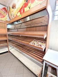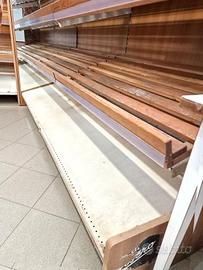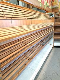 2 scaffalature in legno self-service usate, si tratta di due scaffalature in legno da supermercati per l'esposizione delle cassette ortofrutta. disponibilità: