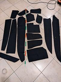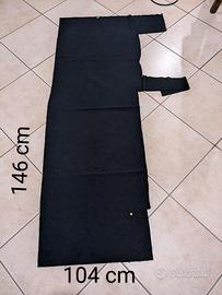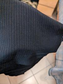 2 scampoli e varie rimanenze di produzione tessuto di cotone elasticizzato, misure come in foto. Il tessuto è color blu navy con righe sottili di color grigio-marrone. Peso totale 700 grammi. Il tessuto è nuovo.