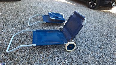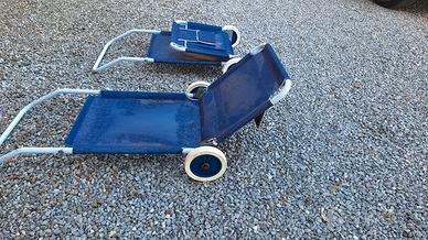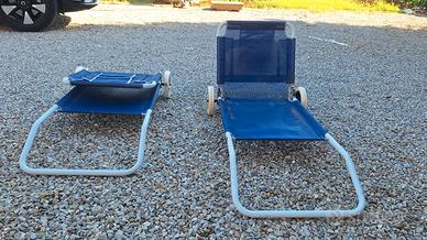 Coppia di sdraio pieghevoli in tessuto blu con struttura in metallo e ruote laterali.