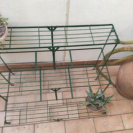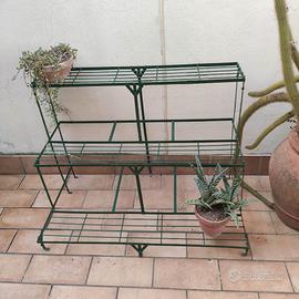 in vendita due eleganti supporti vintage (identici) per piante a tre livelli in metallo verde scuro, ideale per organizzare vasi su balconi, terrazzi o in giardino. Questo tipo di scaffale, spesso chiamato "scala per piante" o étagère, è progettato per ottimizzare lo spazio verticale e garantire a ogni pianta una corretta esposizione alla luce. Dettagli del Prodotto Materiale: ferro con verniciatura a polvere epossidica per resistere agli agenti atmosferici. Struttura: tre ripiani a griglia rettangolari disposti a gradini. Dimensioni : 100 cm di lunghezza, 60 cm di profondità e 75 cm di altezza. no spedizioni