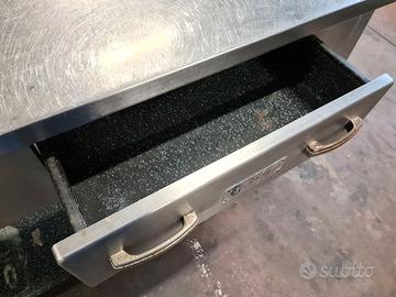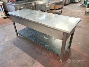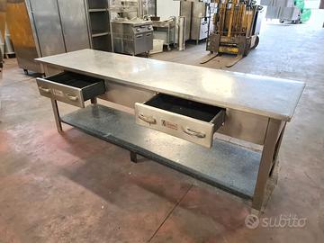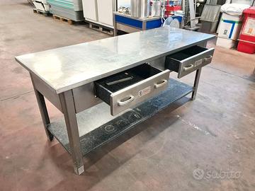 2 tavoli inox con cassetti usati, si tratta di due tavoli in acciaio inox dotati di cassetti utilizzati come tavoli per la preparazione dei piatti in ambienti come: ristoranti, pizzerie, cucine professionali, etc. purtroppo i ripiani inferiori sono in ferro. disponibilità: