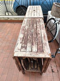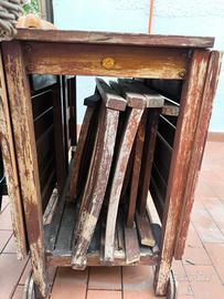 I tavoli sono pieghevoli e facili da spostare grazie alle rotelle. Struttura solida, ma necessitano di restauro/rinfresco (verniciatura o sistemazione piano) secondo le proprie esigenze.