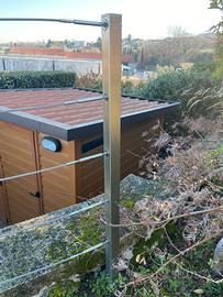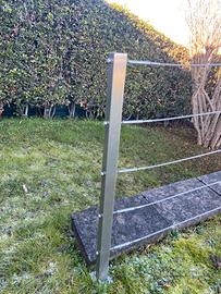 Ringhiera in acciaio inox 304, composta da 24 pali quadrati da 4 cm x 4 cm, alti 1,40 mt con la possibilità di piantarli nel terreno con una zanca già installata da 40 cm oppure si possono accorciare e fare tutte le modifiche che si vuole.