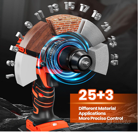 25+3 Regolazioni di Coppia: Il trapano multifunzione è dotato di 25+3 regolazioni di coppia, che gli consentono di occuparsi della maggior parte dei lavori, e di due velocità (0-450 giri/min/0-1650 giri/min) a variazione continua che rendono l'avvitamento e la foratura più precisi.