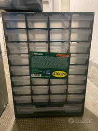 Portaminuterie da parate della marca parkside con cassettini trasparenti 2 di un tipo e 1 di un’altro , comprati ma mai usati ne tanto meno scartati dalla loro confezione.