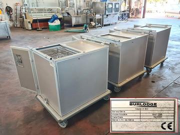 3 carrelli di servizio caldo/freddo usati, si tratta di tre carrelli isotermici divisi in due parti: una che scalda e una che fa freddo. uno è completo di griglie interne mentre negli altri due sono mancanti, dotati di ante scorrevoli nella parte superiore e manici per il trasporto.