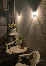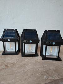 TRE Lampade - Lanterne solari per il Giardino o uso esterno. Norme CE Lanterne da Parete in ABS Facili da Installare IP65 Impermeabile per Esterni Altezza 17 CM OMAGGIO 3 mini fili di luci a Led per decorare Ghirlande o vasi in vetro Con rilevatore di movimento e sensore crepuscolare con nuova lampada con filamento a LED. lampada solare a Luce calda. Bellissime NUOVE MAI USATE, Senza Scatola . Utilizzabili in esterni. Non servono fili o impianti, si applicano al muro. Si ricaricano durante il giorno in esterno (ovviamente devono essere esposte ai raggi solari) e si accendono quando è buio, con sensore di movimento. Tre Modalità: premendo il tasto una volta si accende la lampada al passaggio e dopo un paio di minuti si spegne. Utile in un ingresso. La seconda modalità è che resta sempre accesa fioca e aumenta di intensità appena rileva un movimento