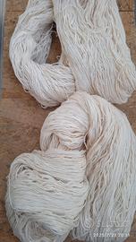 tre matasse di filato morbido tipo lanetta, color avorio. In totale possono essere circa 800 g. (non ho la bilancia per pesi piccoli). Il filo è morbido e compatto, adatto a lavorazioni a maglia o uncinetto.
