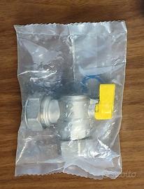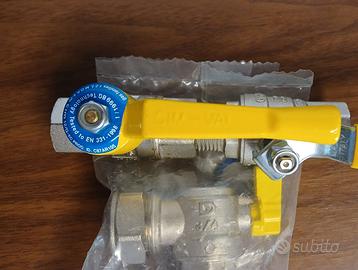 1 valvola a sfera a squadra per gas, femmina-femmina da 3/4" con dado girevole in busta. 2 valvole a sfera gas con leva piatta 3/4", 1FF, 1MF.