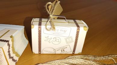 34 Bomboniere valigia, di carta, da montare, con cordino e cartellino