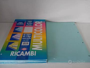 37 blocchi ricambi forati per raccoglitore ad anelli formato A4 varie rigature: 13 ricambio rinforzato bianco 4 fori formato A4 rigatura Q 90gr. (quadretto con margini) 3 ricambio rinforzato bianco 4 fori formato A4 rigatura 10mm 90gr. (quadretto 1 cm) 6 ricambio rinforzato bianco 4 fori formato A4 rigatura A 90gr. ( 1° e 2° elementare) 2 ricambio colorato 4 fori formato A4 rigatura 5mm 80gr. (quadretto senza margini) 6 ricambio colorato celeste 4 fori formato A4 rigatura 1 rigo 90gr. (un rigo senza margini) 7 ricambio colorato giallo 4 fori formato A4 rigatura 1 rigo 90gr. (un rigo senza margini) spedizione disponibile