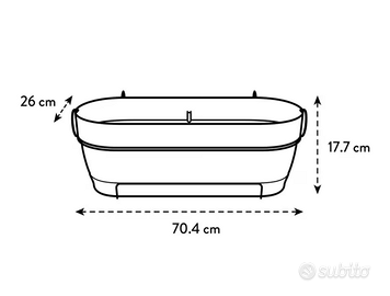 Vendo fioriera da balcone Elho modello Vibia Campana Trough da 70 cm. In ottime condizioni. Perfetta per balcone o ringhiera, ideale per fiori, piante aromatiche o piante decorative. Caratteristiche: Modello: Elho Vibia Campana Trough Lunghezza: 70 cm Altezza: circa 17,7 cm Colore: terra / terracotta Con supporto per ringhiera incluso Con serbatoio d’acqua integrato Materiale: plastica resistente e riciclata Adatte per uso esterno (resistenti alle intemperie) Ci sono 4 pezzi disponibili. Prezzo indicato per fiorera. È possibile acquistare 1, 2, 3 o tutte e 4,