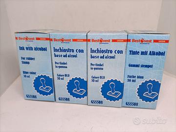 4 scatole di inchiostro Blu per timbri in gomma Bestovest Innovazione GS5508, con le istruzioni in diverse lingue.