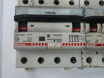 Interruttore magnetotermico Bticino. - Modello: G8843A/20AC - Corrente nominale: C20 - Corrente differenziale: IΔn 0.03A - Tensione: 400V- - Funzione salvavita con test mensile. più alti 2 interruttori