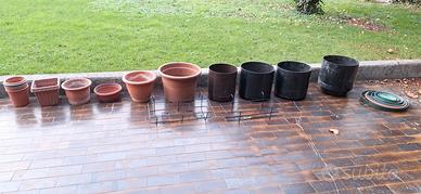 4 porta vasi con ruote altezza 40 cm. Diametri: uno cm 40, gli altri 3 cm 35. uno dei 3 da 35 è marrone. gli altri sono neri.
