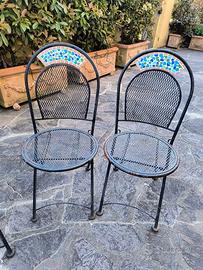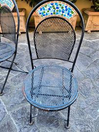 Vendo 4 sedie da giardino in ferro pieghevoli, stile bistrot con inserto decorativo a mosaico sullo schienale. Struttura solida e comode, ideali per terrazzo o giardino. Normali segni d’uso e qualche punto di ruggine superficiale (come da foto), facilmente sistemabile.