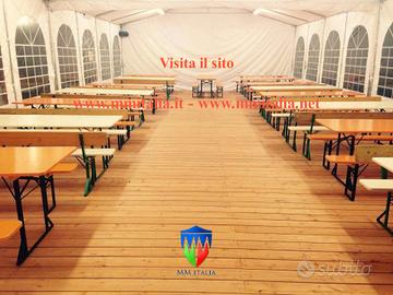 Panche e Tavoli Birreria - Set Birreria Professionali MM Italia Group Linea Golden Prodotto per uso Professionale,con verniciatura Ignifuga, adatte per Noleggio Sagre ecc... Set Panche e Tavoli Pieghevoli Linea Golden, Set Birreria per uso Professionale, che sopporta qualsiasi sollecitazione, adatto per Mense,Sagre Paesane, Feste Patronali,Ristoranti, Bar, Adunate, Eventi Pubblici e Privati, Pro Loco, Noleggio Spessore piano tavolo 2,4 cm. spessore piano panca 2,8 cm. Attenzione La Verniciatura è Ignifuga, é richiesta per qualsiasi uso Pubblico, noi la forniamo di Serie !!!!!!. Il Telaio portante, é Angolare Continuo di 3 cm. per spessore di 3 mm. ( NON 2 MM. COME TANTI IN COMMERCIO, CHE DOPO AVERLI USATI ALCUNE VOLTE IL TELAIO SI PIEGA !!!!), Disponibili nelle versioni : 220 x 80 cm. ( NON 75 CM. COME MOLTI IN CIRCOLAZIONE ) 220 x 67 cm. 220 x 50 cm. 200 x 80 cm. ( NON 75 CM. COME MOLTI IN CIRCOLAZIONE ) 200 x 67cm. 200 x 50cm. MINI SET 160 x 60 cm. ( Solo Verniciatura Naturale ) Panche con o senza schienale, Colore – Ocra – Naturale – Noce Chiaro – Arancio Forniamo anche solo i pannelli visita il nostro sito web, e vedrai le super offerte 2026 Preventivi Personalizzati per Quantita´superiori a 100 Set www.mmitalia.it Visita il Link : http://www.mm-italia.com/Specificazione%20tecniche/Prezzi%20-%20Tavoli-panche.htm ( attenzione ci possono essere delle variazioni di prezzo durante l´anno, quindi fa fede insindacabilmente il sito ufficiale mm italia ) Visita : www.mmitalia.it Siamo anche Produttori di Tendostrutture, Tendoni per ristorazione magazzino deposito Rimessaggio Contatti Team MM Italia Group