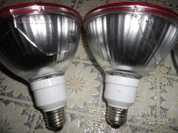 vendo 5 lampade come in foto, sono a luce neon 23watt risparmiose attacco e 27, modello par 38, ip 65. Le luci sono colorate e hanno una lesione sulla calotta retro come si può vedere dalle foto, però funzionano perfettamente e non sono mai state usate. Rosso, bianco, verde e blu.