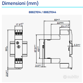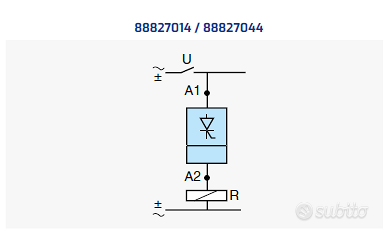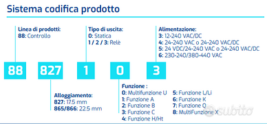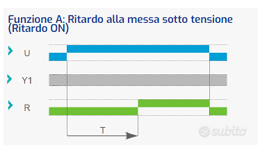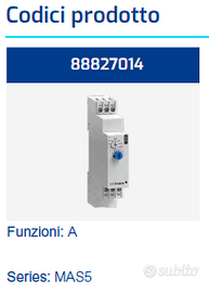 5 Temporizzatori modulari Crouzet modello 88-827-014 Crouzet 88827014 fa parte della serie Chronos 2 ed è un temporizzatore modulare ad alte prestazioni, noto per la sua versatilità e affidabilità in contesti industriali. Il modello specifico MAS5 è un relè temporizzato monofunzione. •Funzione (Mono-funzione): Il modello MAS5 è dedicato alla funzione A: Ritardo all'eccitazione (Delay on make). Quando viene applicata tensione, il conteggio del tempo inizia; al termine del ritardo impostato, il relè di uscita si attiva. •Gamma Temporale: Offre un'ampia flessibilità con 7 intervalli di tempo selezionabili tramite selettore rotativo: oDa 1 secondo a 100 ore (1s, 10s, 1min, 10min, 1h, 10h, 100h). •Tensione di Alimentazione: È un dispositivo multitensione, operante in un range che va da 24 a 240 V AC/DC, il che lo rende compatibile con quasi tutti i quadri elettrici standard. •Uscita: Dispone di 1 contatto in scambio (SPDT) con una portata di 8 A. ## Specifiche Tecniche CaratteristicaDettaglio Tipo di montaggioGuida DIN (35mm) Larghezza17,5 mm (formato compatto "slim") Precisione di ripetizione±0,5% Grado di protezioneIP40 (frontale) / IP20 (terminali) Temperatura operativaDa -20°C a +60°C 1.Semplicità d'uso: Essendo una monofunzione, la configurazione è immediata: si imposta solo la scala dei tempi e la percentuale desiderata tramite i due potenziometri frontali. 2.Ingombro Ridotto: Grazie alla larghezza di soli 17,5 mm, permette di risparmiare spazio prezioso all'interno del quadro elettrico. 3.Indicatori LED: Presenta un LED verde per indicare la presenza di alimentazione (lampeggiante durante la temporizzazione) e un LED per lo stato dell'uscita. Nuovi, imballati, mai usati Garantisco massima serietà Pagamento e spedizione con portale Vendo in blocco a 70 euro ( se interessati, ne ho diverse decine di pezzi )