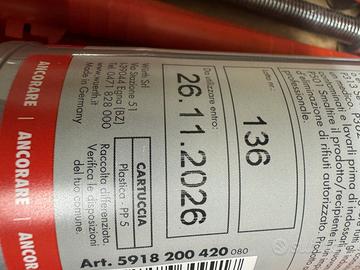 50 tasselli e viti da cemento di varie misure Fischer e Wurth per cemento piu un ancorante Wurth con scadenza 11/26 Tasselli 4 da 6 x 65m 3 da 8 x 65mm 14 da 8 x 110mm 3 da 8 x 160mm 3 da 10 X 210mm Viti da cemento 10 da 6 ×40mm 12 da 10 x 100mm 1 da 10 x 240mm