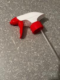 Vendesi testine nebulizzatrici (trigger spray) professionali di colore rosso e bianco, complete di cannuccia pescante lunga. Ideali per flaconi di detergenti, prodotti per il giardinaggio, sanificanti o fai-da-te.
