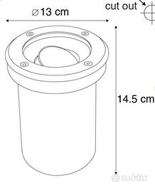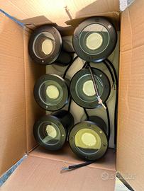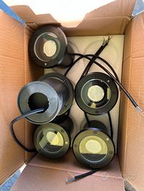 6 Faretti orientabili compresi di lampada, tutto nuovo, realizzati in acciaio inossidabile e vetro infrangibile carrabile e interrabile, rifinito in colore nero. Nuovi mai usati causa cambio progetto, ha un diametro di 13 cm e 14,5 cm di profondità. Complete di lampade da 7w bianco caldo 3000k luminosa con attacco GU10 (max. 50 Watt). Con il suo valore IP65 il faretto è resistente all'acqua. Nuovi mai usati.