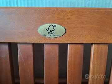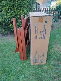 vendo 6 sedie reclinabili da esterno, realizzate in legno di teak verniciato, perciò resistente alle intemperie e, corredate di cuscino con poggiatesta. Le sedie sono dotate di certificazione CFC (ente che garantisce la rintracciabilità del legno, proveniente da foreste e da fonti controllate). Tutte sono dotate di imballo originale, come da foto e si presentano in ottimo stato d'uso. Ogni collo, con imballo, pesa 13 kg perciò l'eventuale spedizione verrà gestita ad hoc. Prezzo di tutte le 6 sedie: 340,00 Telefono: 3496101030