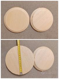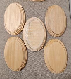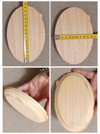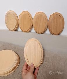 Set di 7 basi in legno naturale da personalizzate, per amanti fai da te o artisti. Forme già lavorate ma il legno è grezzo naturale, devono quindi essere levigate e poi finite a piacere. Perfette per un uso classico come basi o piedistalli da impregnare e adattare all'oggetto da esporre o da collezione. Ma sono ideali anche per progetti creativi e artistici perché posso o essere anche dipinte e diventare piccoli quadri. 5 basi ovali circa 15,5 x 10,5 cm 2 basi rotonde diametro 15,5 cm
