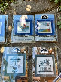 9 diversi kit di ricamo a punto croce della collezione DMC Permin of Copenhagen. Questi kit vintage includono solitamente tutto il necessario per completare il progetto: tela Aida (spesso in cotone a 14 punti), filati di cotone DMC e istruzioni dettagliate Vari soggetti Natale, faro, cucina, neonati