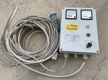 Quadro elettrico usato a 220v per comando pompa sommersa da 3HP. Con funzionamento manuale/automatico, pulsante protezione di emergenza, misuratore di Ampere (A) e misuratore di Volt (V). Con cavo guainato da 4 millimetri sia per l'alimentazione del quadro che alla pompa.