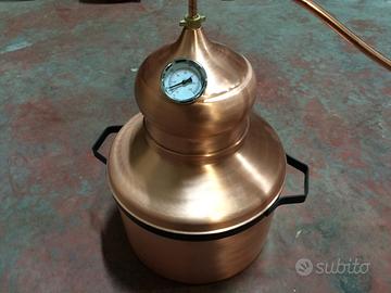 Alambicco distillatore da 23 litri a serpentina, tutto in rame massiccio (1.06 mm. uso alimentare, tubi serpentina uso sanitario, termometro e manici in acciaio installati, prodotto artigianale Made in Italy. Astenersi perditempo, spedizione in tutta Italia anche in contrassegno.