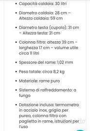 Alambicco distillatore artigianale in rame da 30 litri con colonna. Completo di termometro, griglia per purea, filtri in rame e condensatore fungo.